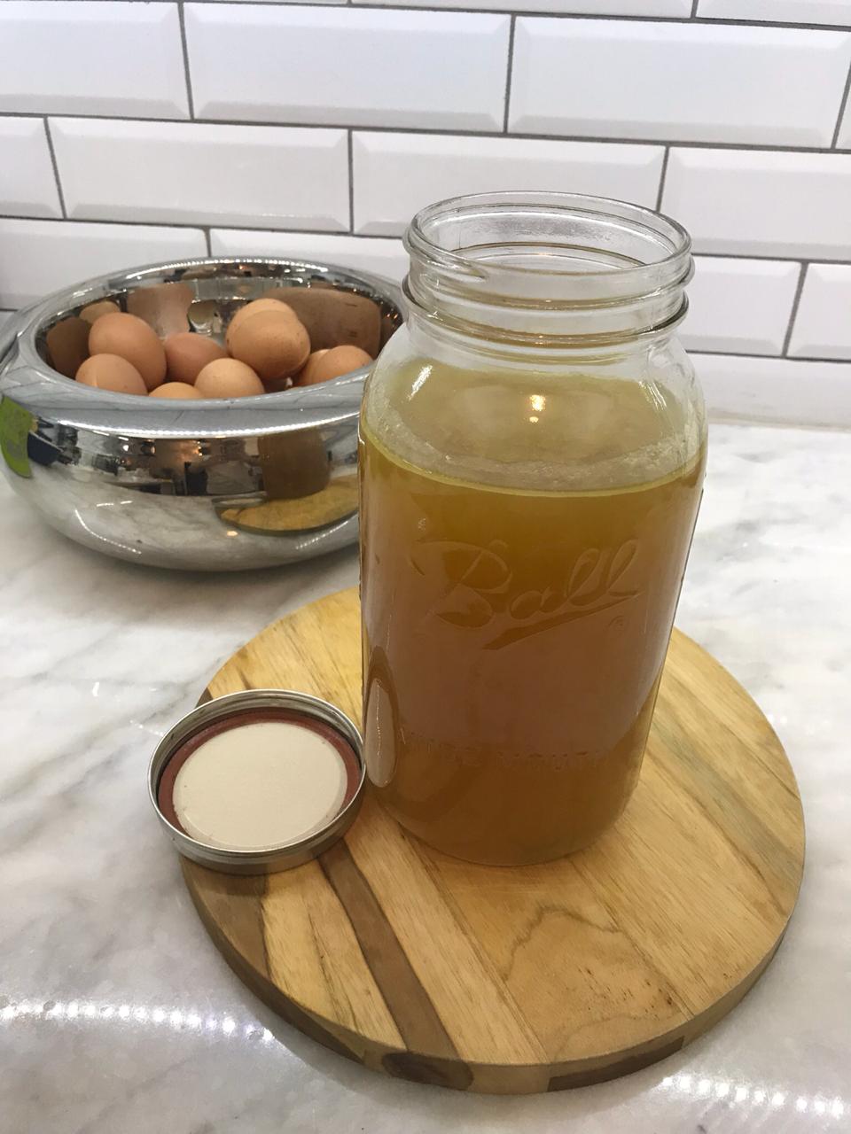 - Si se desea hacer fondo de pollo, el procedimiento es el mismo, sustituyendo los huesos de res por huesos de pollo. Agregar alas y patas de pollo aumenta la cantidad de colágeno en el fondo y lo vuelve más espeso. Puede agregarse un par de dientes de ajo o un trozo de jengibre.