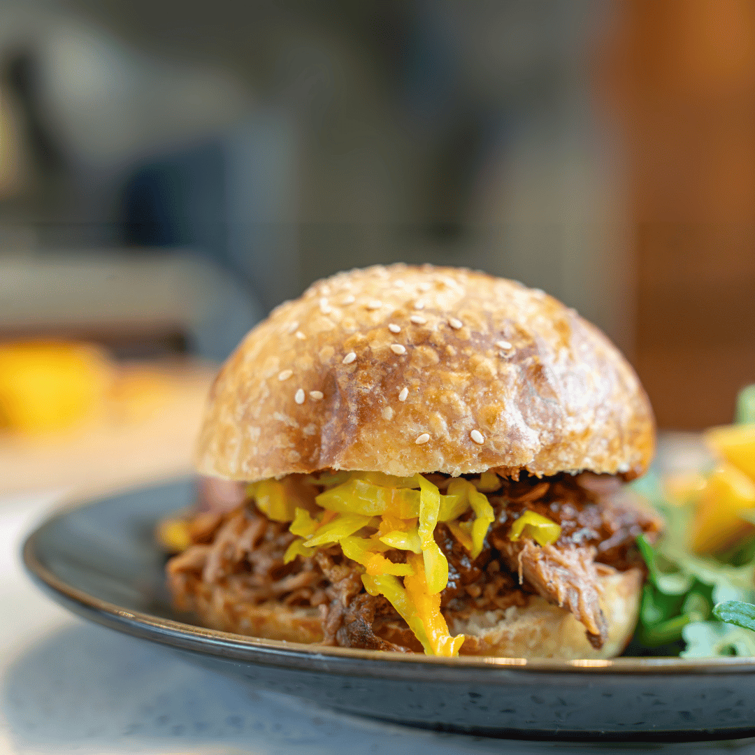 Coloca un recipiente grande y profundo en el fuego y llena de agua hasta 1/3 de altura. Dentro de este introduce un recipiente de menor tamaño que resista el calor. Aquí puedes agregar la bolsa cerrada de Pulled Pork. - Ensambla todos los ingredientes