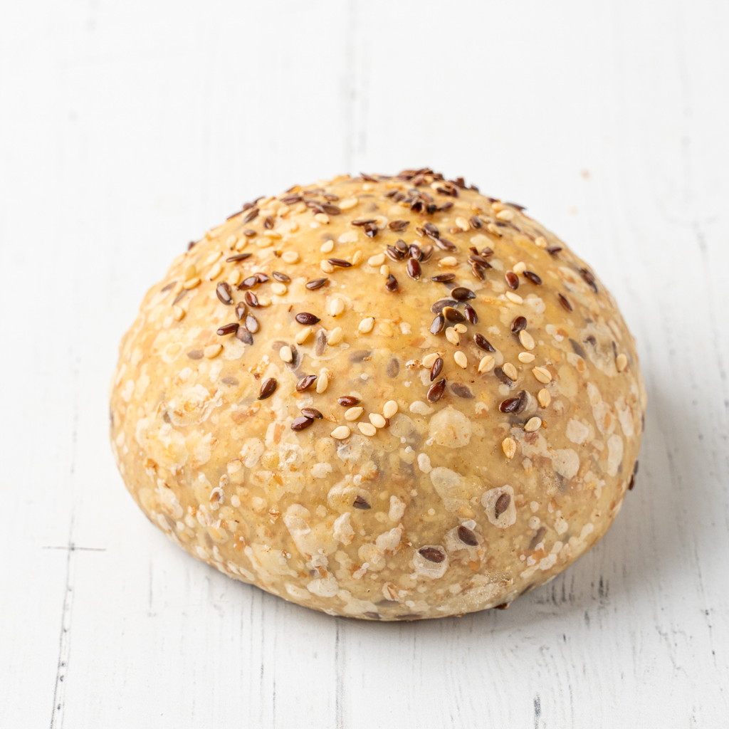 Bollito de masa madre con linaza y ajonjoli. La forma ovalada es perfecta para hacer sandwiches o para hamburguesas.