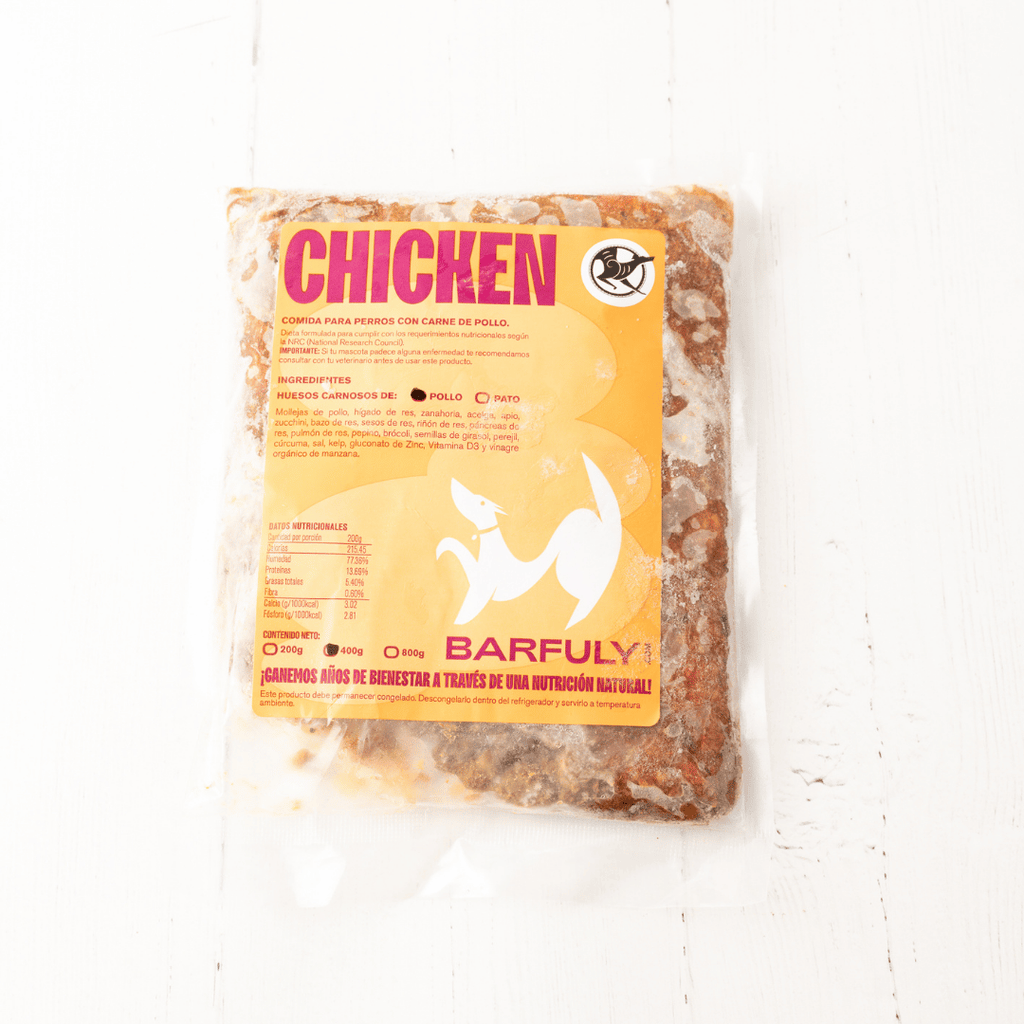 Comida para mascotas con carne de pollo esta formulada por profesionales veterinarios siguiendo los requerimientos nutricionales NRC para ofrecer a tu mascota para ofrecer a tu mascota una proteina de alta calidad y digestibilidad, ideal para perros que inician la transicion a alimentacion natural.