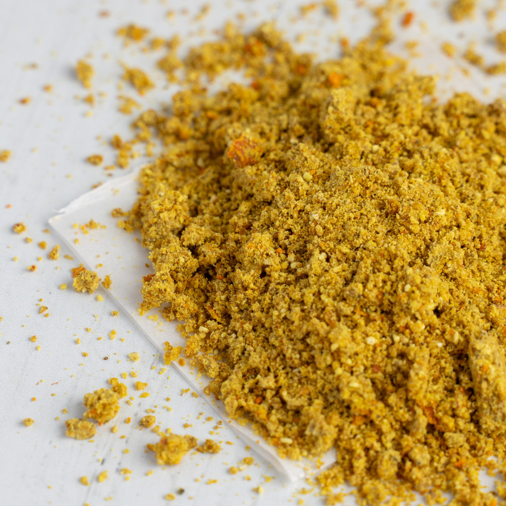 Consome 100% natural. Ingredientes: harina de platano, ajonjoli crudo, curcuma, pimienta y sal.