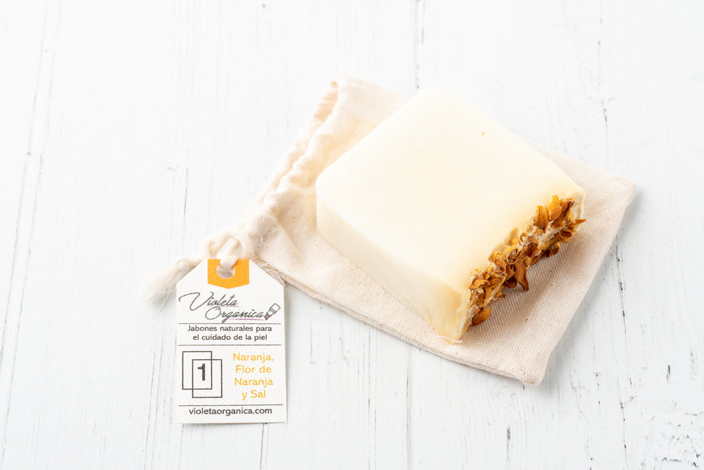 Jabón clásico anti-edad con Naranja que aporta antioxidantes y vitamina C, la Sal marina contiene minerales como magnesio, zinc, calcio, potasio y yodo.