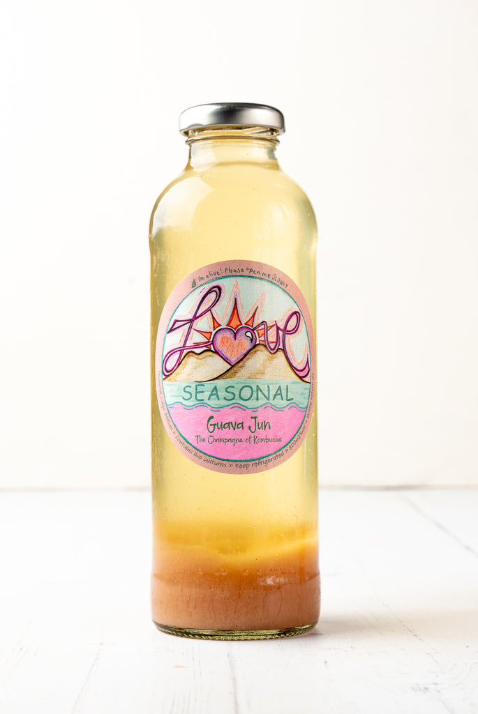 Jun de Guayaba es lo que llamamos "El champán de la kombucha. La diferencia entre Jun y kombucha es que Jun se basa en miel en lugar de azíºcar y se combina con té verde.