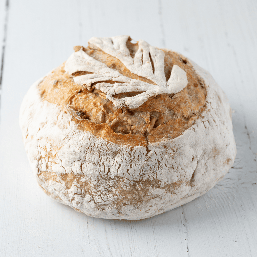 Pan campesino de masa madre hecho solo con harina (10% harina integral), agua y sal. Se agrega una variedad de semillas a la masa. La forma redonda es perfecta para lucir en el centro de mesa para una cena especial.