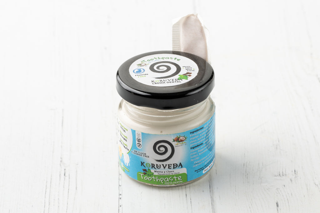 Pasta dental hecha a base de aceite de coco, aceites esenciales y el mineral silica. En medicina Ayurveda, el aceite de coco se usa para desintoxicar la boca; desintoxica la lengua y desinflama las encías. El aceite de coco es un antibacterial y anti fungicida por naturaleza. Aceite de clavo, menta, canela y hierbabuena, anti inflamatorios, antisépticos y que combaten el mal aliento. Silica que es un mineral que desintoxica y extrae metales pesados de la boca.