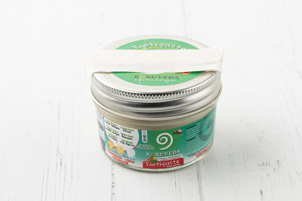 Pasta dental hecha a base de aceite de coco, aceites esenciales y el mineral silica. En medicina Ayurveda, el aceite de coco se usa para desintoxicar la boca; desintoxica la lengua y desinflama las encías. El aceite de coco es un antibacterial y anti fungicida por naturaleza. Aceite de clavo, menta, canela y hierbabuena, anti inflamatorios, antisépticos y que combaten el mal aliento. Silica que es un mineral que desintoxica y extrae metales pesados de la boca.