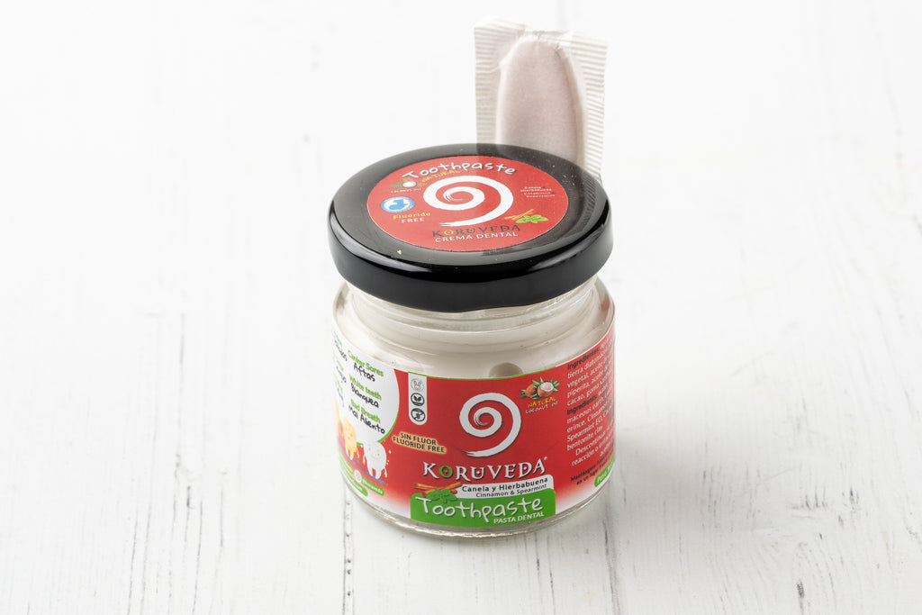 Pasta dental hecha a base de aceite de coco, aceites esenciales y el mineral silica. En medicina Ayurveda, el aceite de coco se usa para desintoxicar la boca; desintoxica la lengua y desinflama las encías. El aceite de coco es un antibacterial y anti fungicida por naturaleza. Aceite de clavo, menta, canela y hierbabuena, anti inflamatorios, antisépticos y que combaten el mal aliento. Silica que es un mineral que desintoxica y extrae metales pesados de la boca.