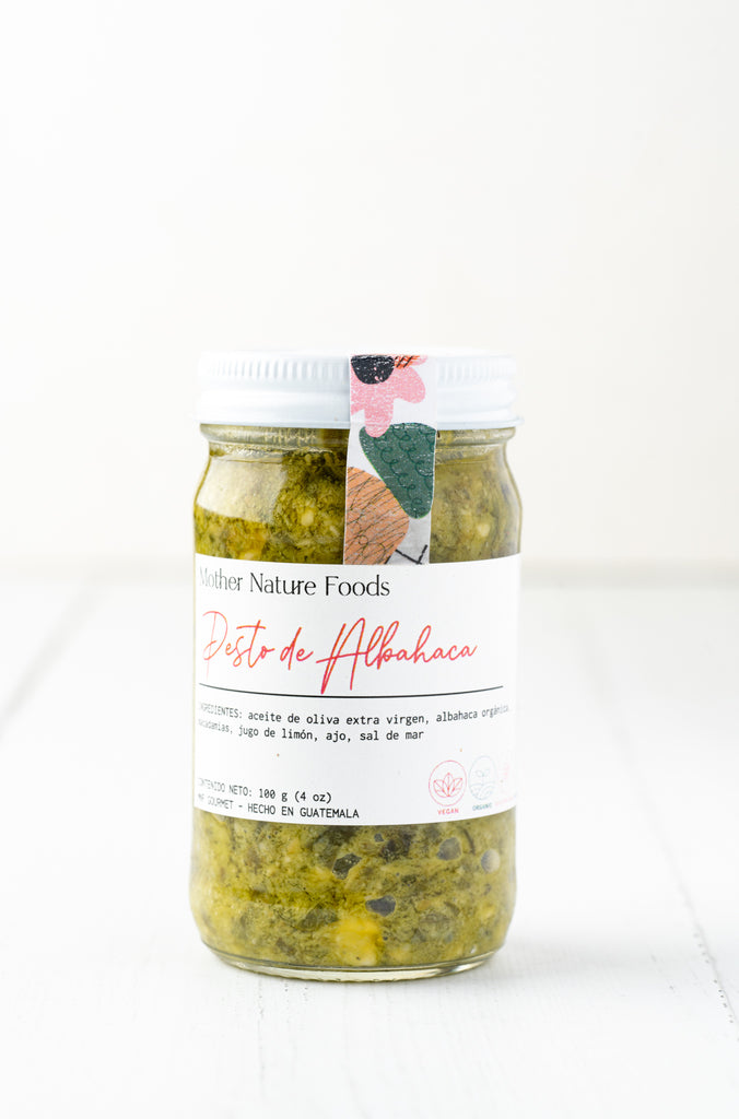 Ingredientes (Vegano): aceite de oliva extra virgen, albahaca orgánica, macadamia, sal, limón y ajo.