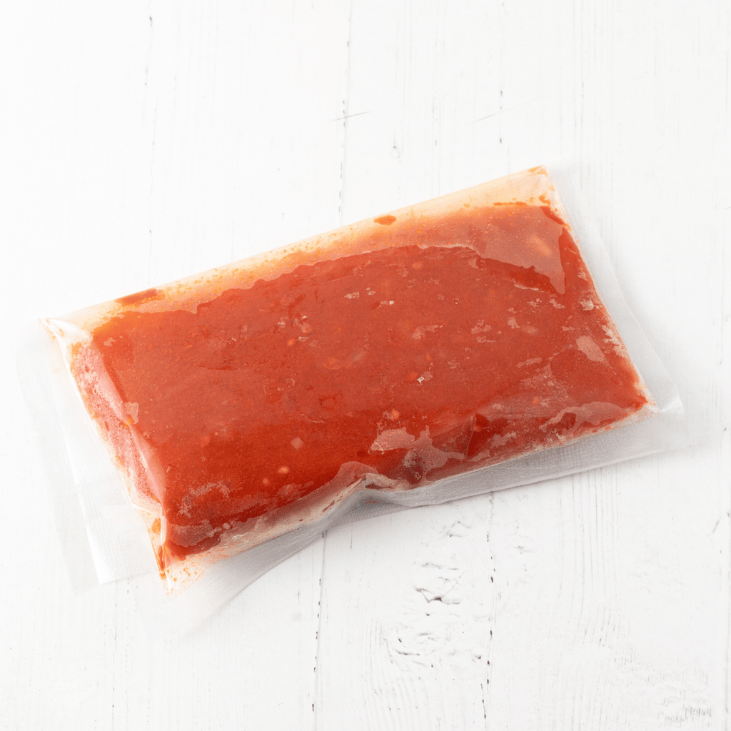 Ingredientes: Tomate san marzano, cebolla, aceite de oliva, sal marino sin yodo, especias.