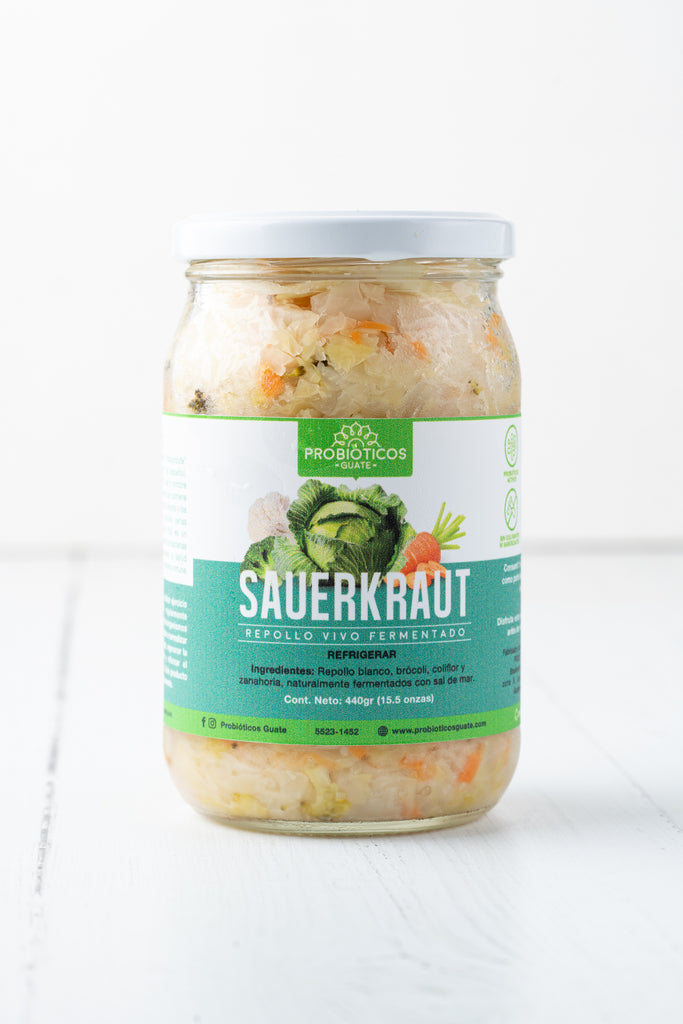 Deliciosa mezcla de repollo blanco, zanahoria, brócoli y coliflor, fermentados naturalmente con sal de mar, sin aditivos, sin vinagre, sin pasteurizar.