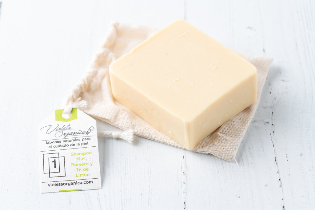 Ingredientes: Aceites saponificados de coco, oliva, canola, soya y ricino, agua, aceite esencial de romero, aceite esencial de te de limón, miel y cera de abejas.