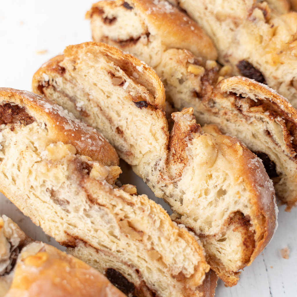 Nuestra trenza combina la calidez de la canela y la riqueza de la macadamia en un pan suave, aromático y perfecto para las celebraciones. ¡Imprescindible en tu mesa esta Navidad! Hecha con pan de masa madre.
